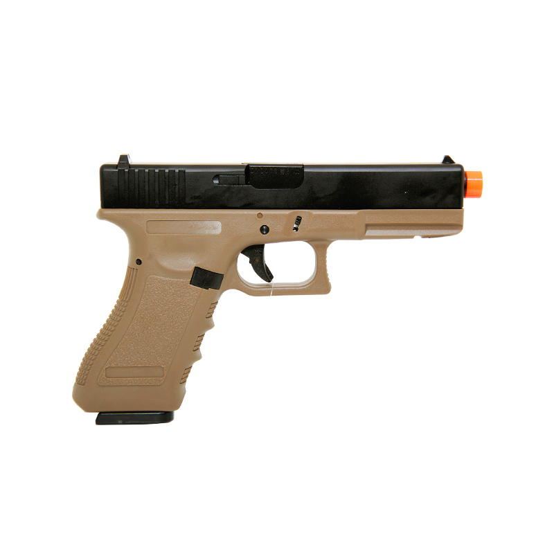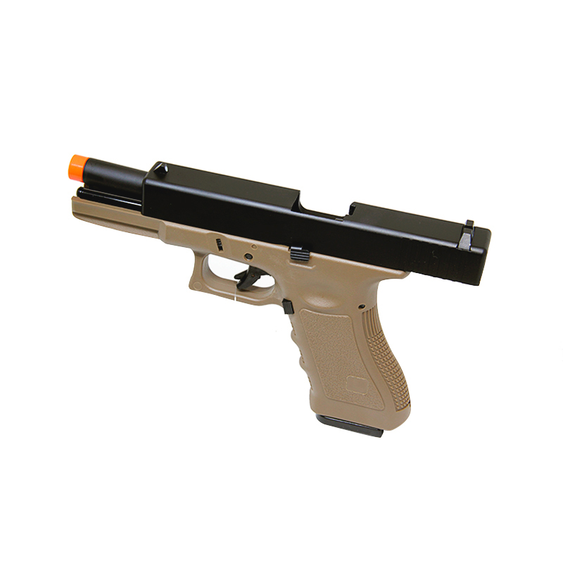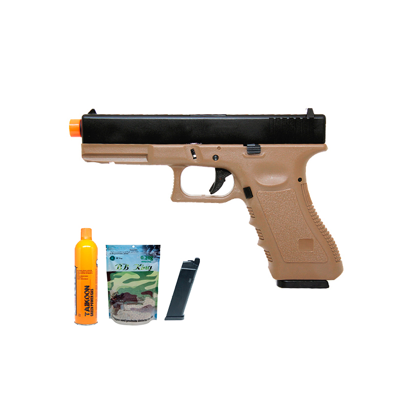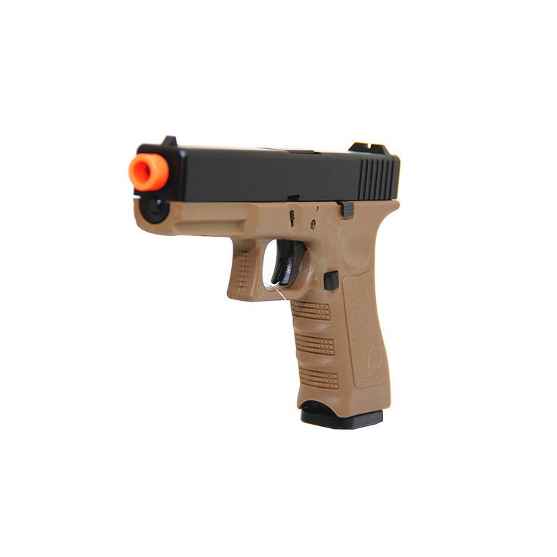 Pistola Glock R17 GBB Tan, construída como a Glock de fogo, slide em metal e corpo em polímero com trava de segurança no slide e gatilho.