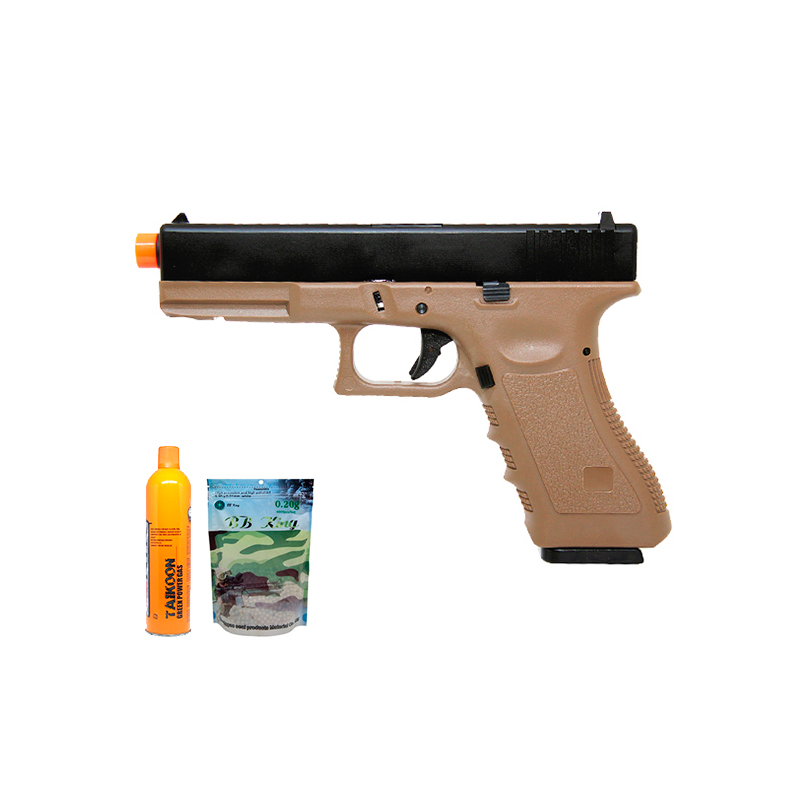 Preparamos para você um Super Combo com: PISTOLA GBB GLOCK R17 TAN + BBS + CILINDRO