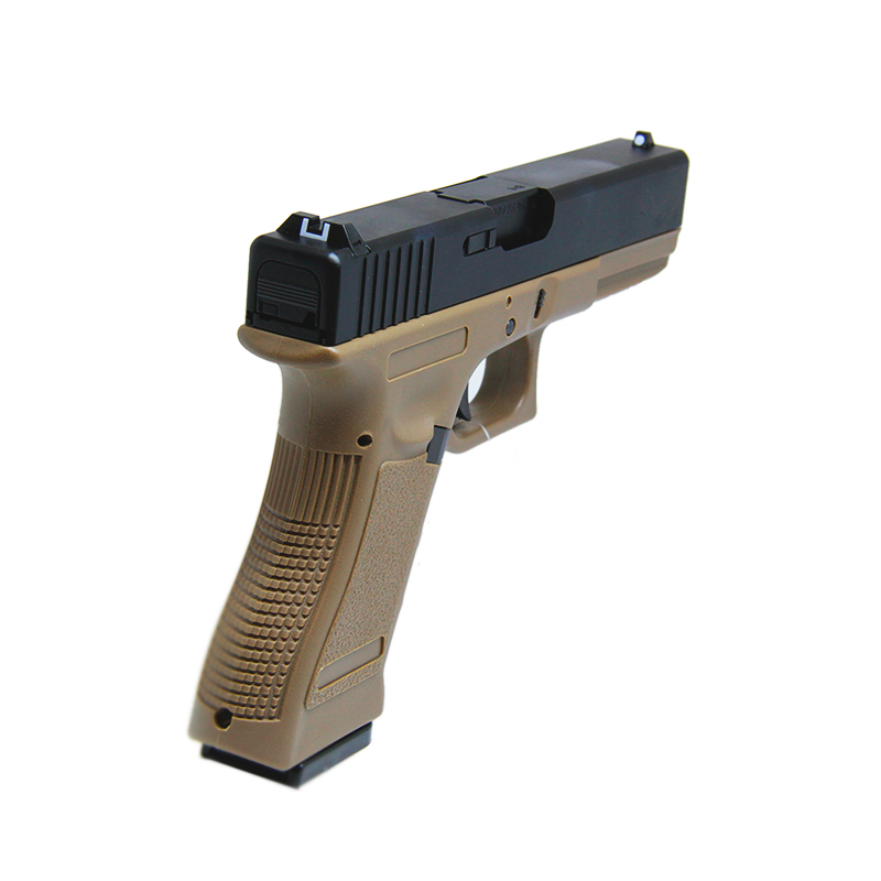 Esta Pistola Glock R17 GBB Tan é construída como a Glock de fogo, slide em metal e corpo em polímero com trava de segurança no slide e gatilho.