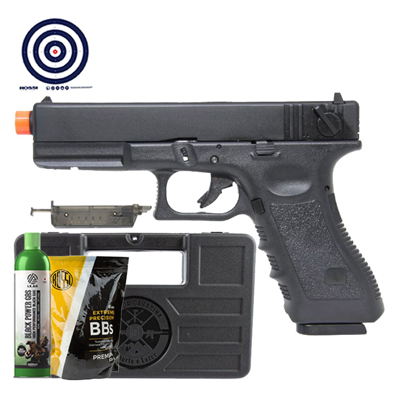 Combo acompanha Green Gás para impulsionar seus disparos, BB's 0.20g para municiar sua pistola e Speedloader para facilitar o municiamento e Alvos de Treino Rossi.