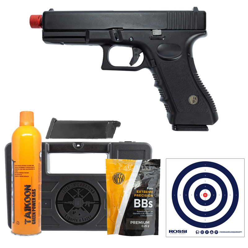V17 ROSSI 2023 PISTOLA AIRSOFT + MAGAZINE GLOCK EXTRA + BBS 0.25G + GREEN GÁS TAIKOON + MALETA LC PARA PISTOLA + ALVO PARA TREINO 14X14 ROSSI