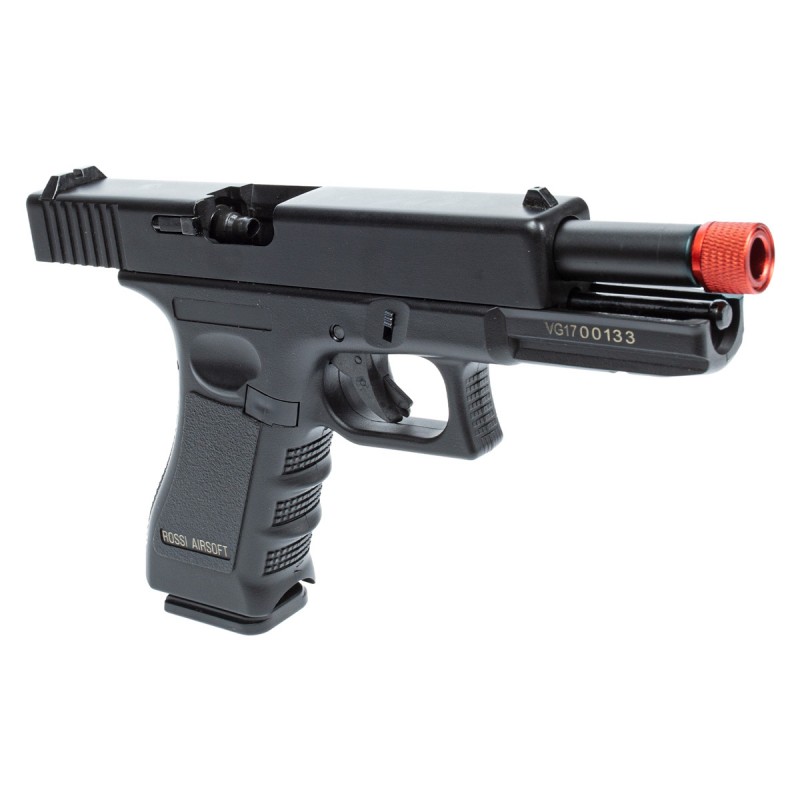 A Pistola Rossi V17 conta com ação semi automático. Ela possui o Slide em Metal com acabamento em metal anodizado e corpo em polímero, semelhante a Glock real. Possui sistema Blowback, e também para aberta quando acaba a munição, dando mais realismo para essa Pistola GBB.