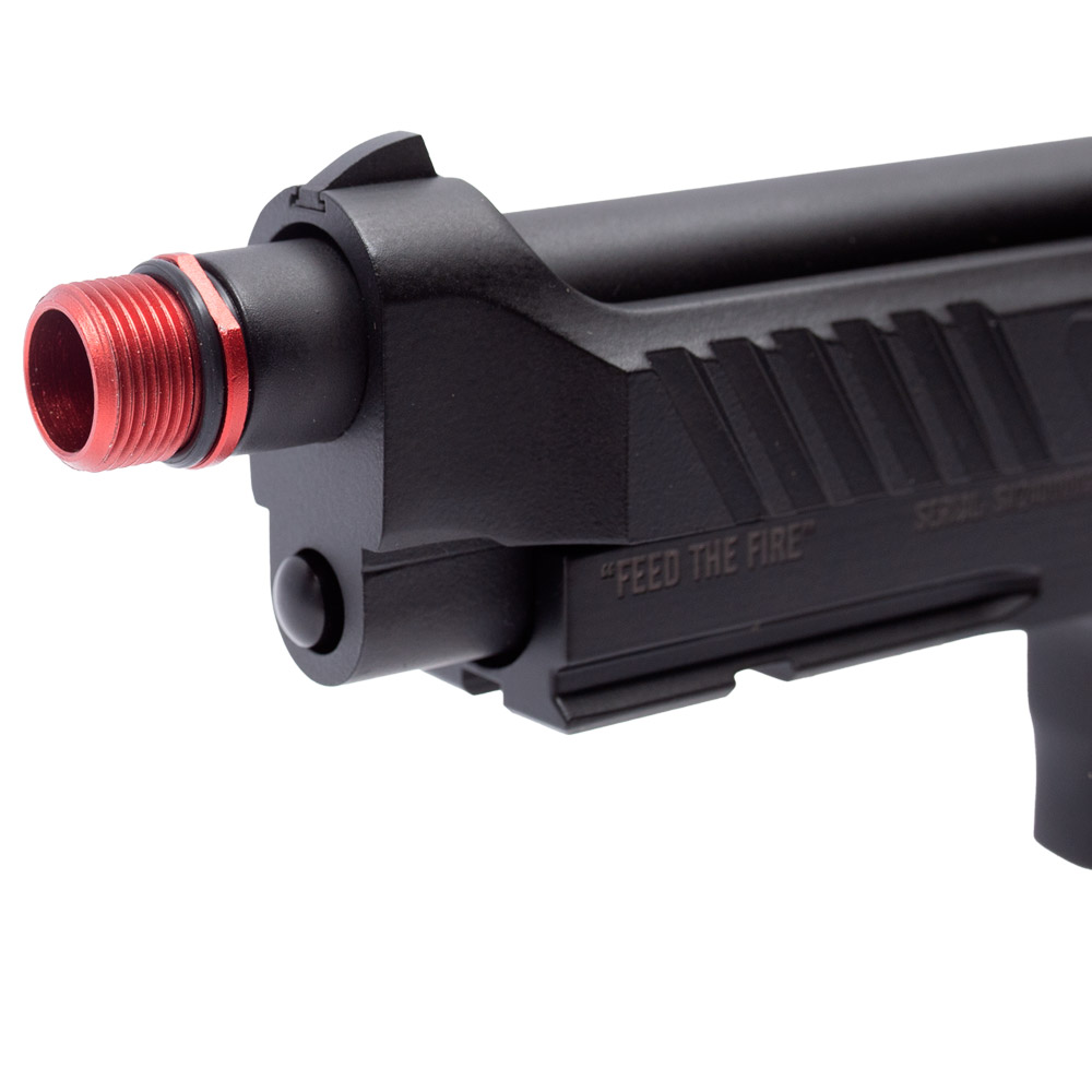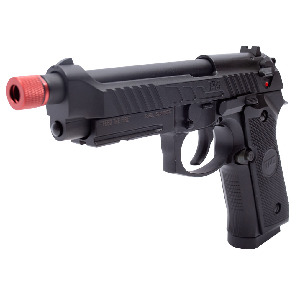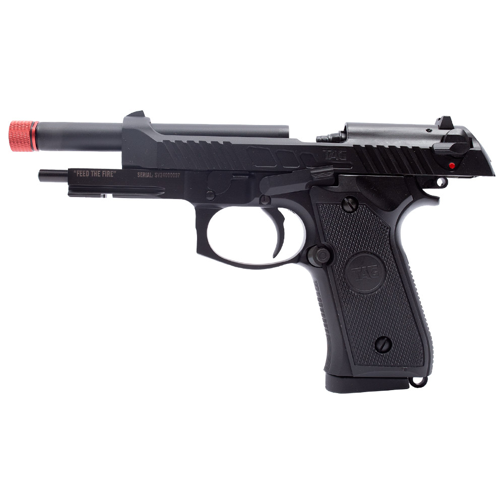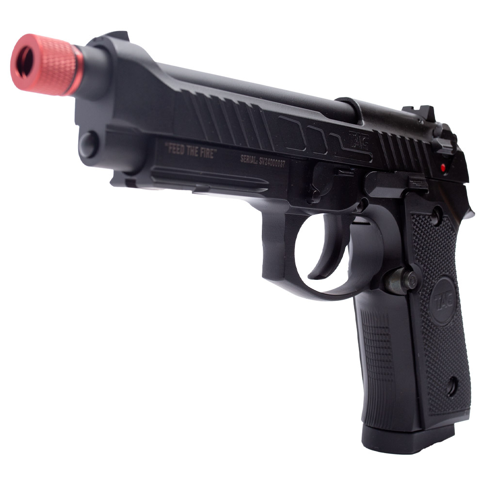 Pistola Airsoft Beretta M92 TAG Savage Feed the fire! Essa pistola a gás da TAG é uma excelente escolha como arma de Backup para os jogos de Airsoft. Fabricada em metal e polímero na cor preta. Mesmo tendo partes em polímero é considerada como FULL METAL, pois seu slide e internos são em metal. Possui trilho inferior para lanterna, padrão picatinny de 20 mm. Alto realismo nos disparos com seu sistema Blowback que é um simulador de recuo que faz o movimento do slide simulando o disparo de uma arma de fogo. Empunhadura texturizada que oferece alta aderência para uma pegada firme que vai oferecer maior estabilidade para os disparos. Cão funcional. Trava de segurança manual localizada na lateral que vai te proteger de disparos acidentais. Ponteira vermelha metálica removível que dá acesso a rosca anti-horária de 14 mm onde você poderá instalar um silenciador para personalizar a sua Beretta Savage TAG.