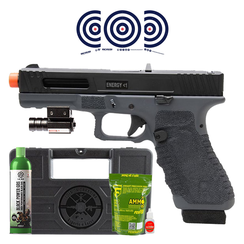 Pistola Airsoft GBB Secutor Glock Gladius 17 Cinza + Mira Laser + Green Gas + BBs + Maleta + Alvos