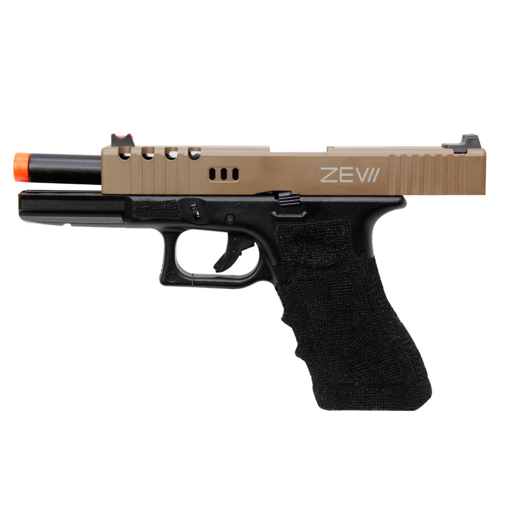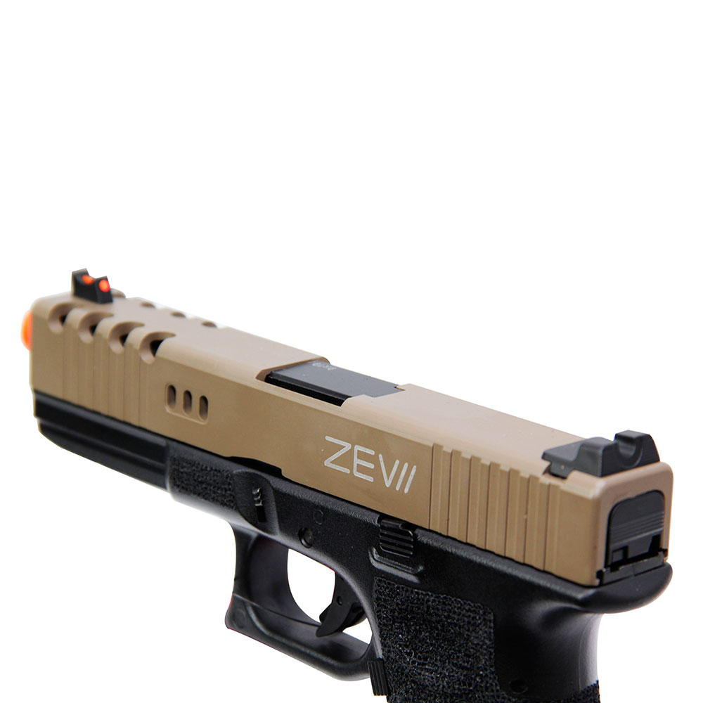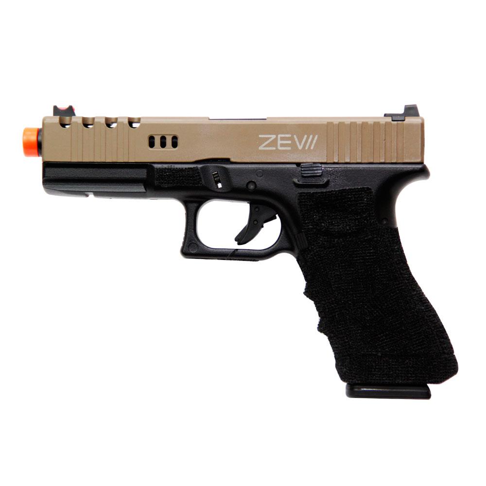 Pistola Airsoft GBB G17 Zev construída com slide em metal, possui sistema de ação do tipo Blowback que a torna ainda mais realista, com design e acabamento incríveis.