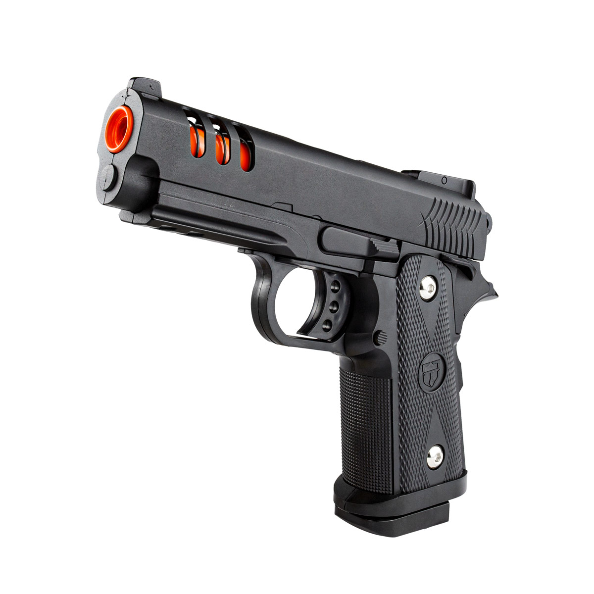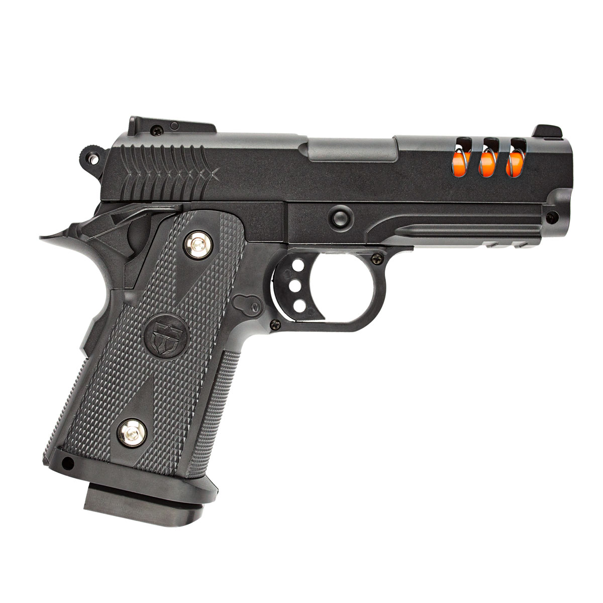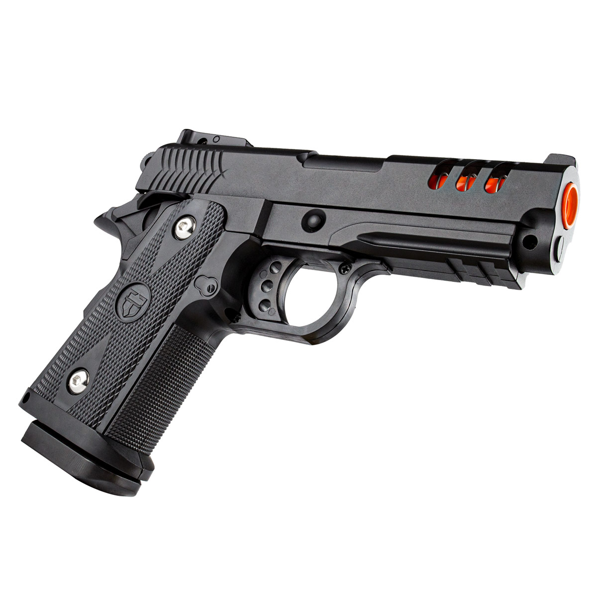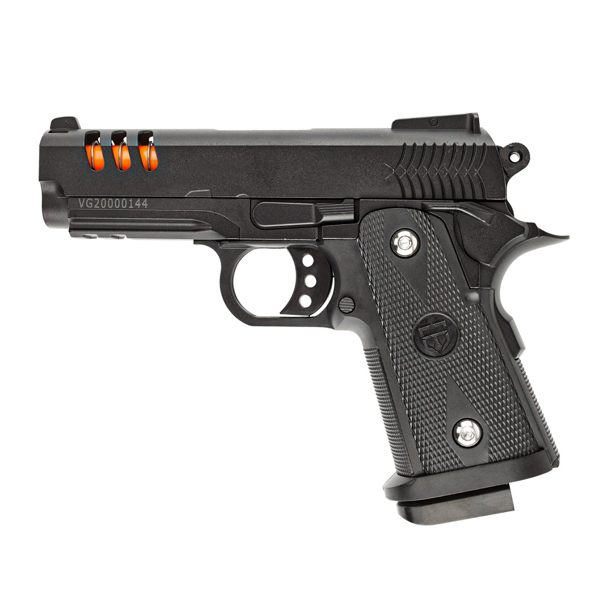 Pistola Airsoft com ação por mola (Spring) fabricada pela Vigor pé um Pistola 1911 short, modelo V15 com slide em metal e corpo em polímero de alta densidade.