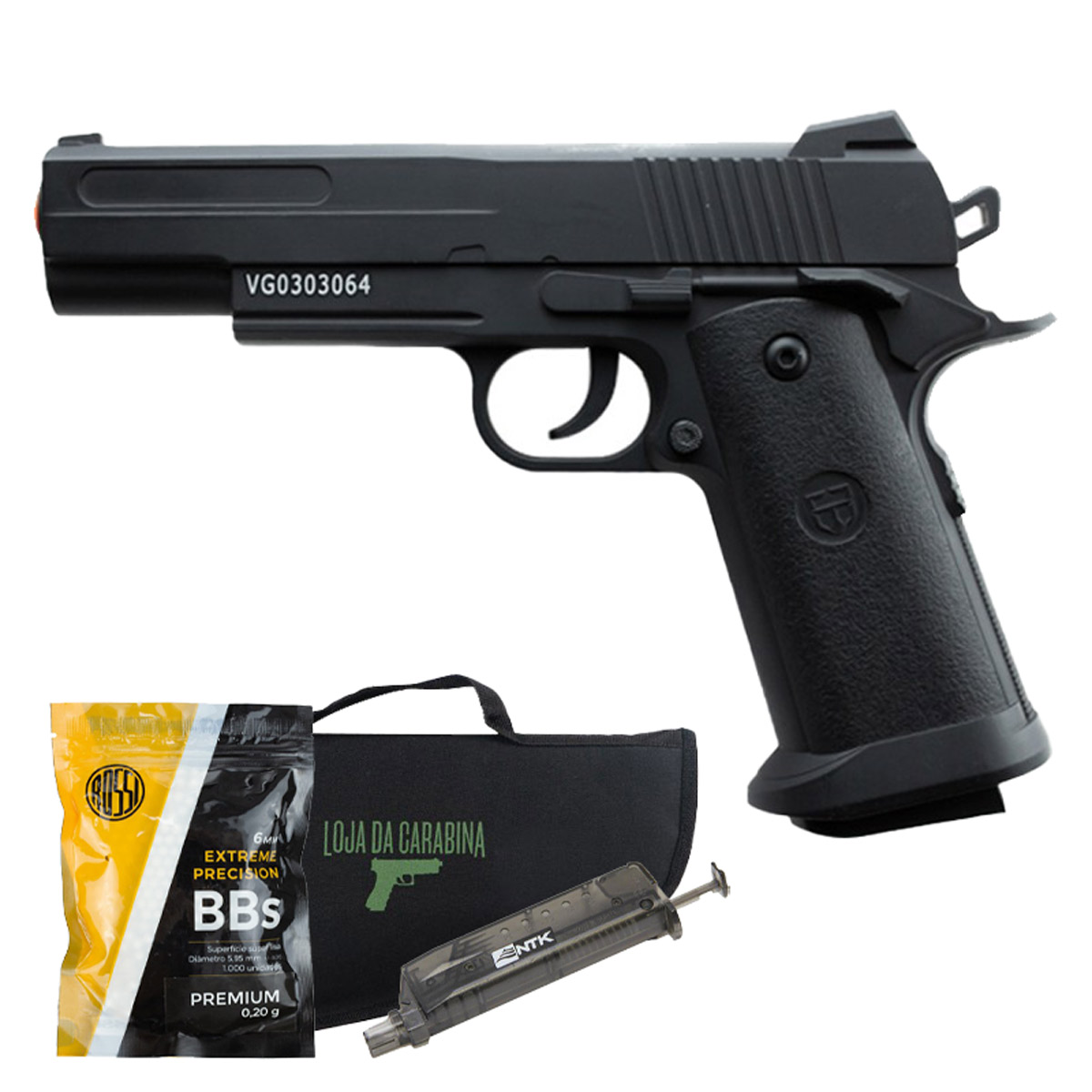 PISTOLA AIRSOFT SPRING 1911 V18 VIGOR + AIRSOFT BBS 0.20 ROSSI PACOTE COM 1000 UNIDADES