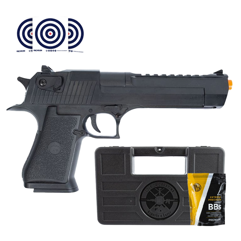 Pistola de Airsoft com ação por mola (spring) QGK Desert Eagle Airsoft. Esse kit contém uma Maleta Rígida para armazenar e transportar sua Pistola, Airsoft BBs 0.12g para recarregar sua arma e Alvos de Treino Rossi.
