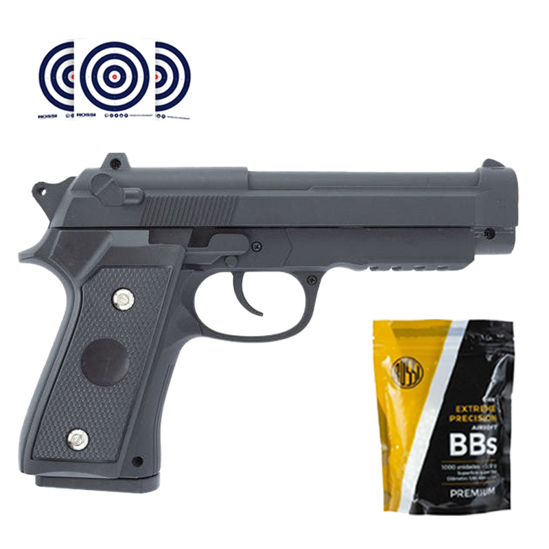 Pistola Airsoft Spring Full Metal PT92 V22 Vigor 6mm + Airsoft BBs 0.12g Rossi + Alvos