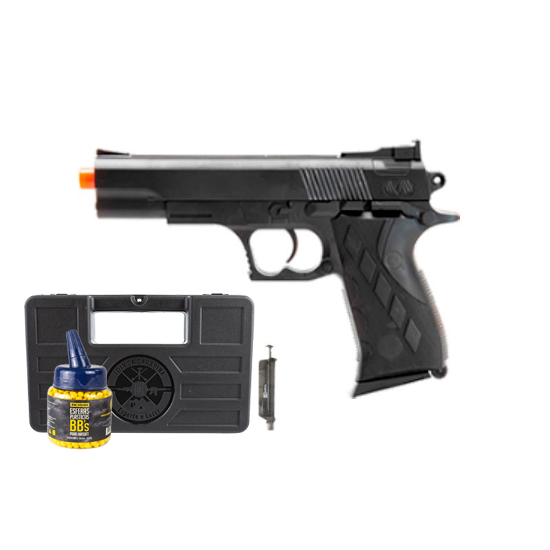Acompanha também munições BBs 0,12g e uma maleta rígida para o transporte prático e seguro.