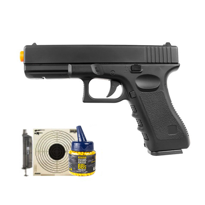 Pistola Airsoft Glock GK-V20 é construída em metal com escala 1/1 e marcações semelhantes a arma de fogo Glock.