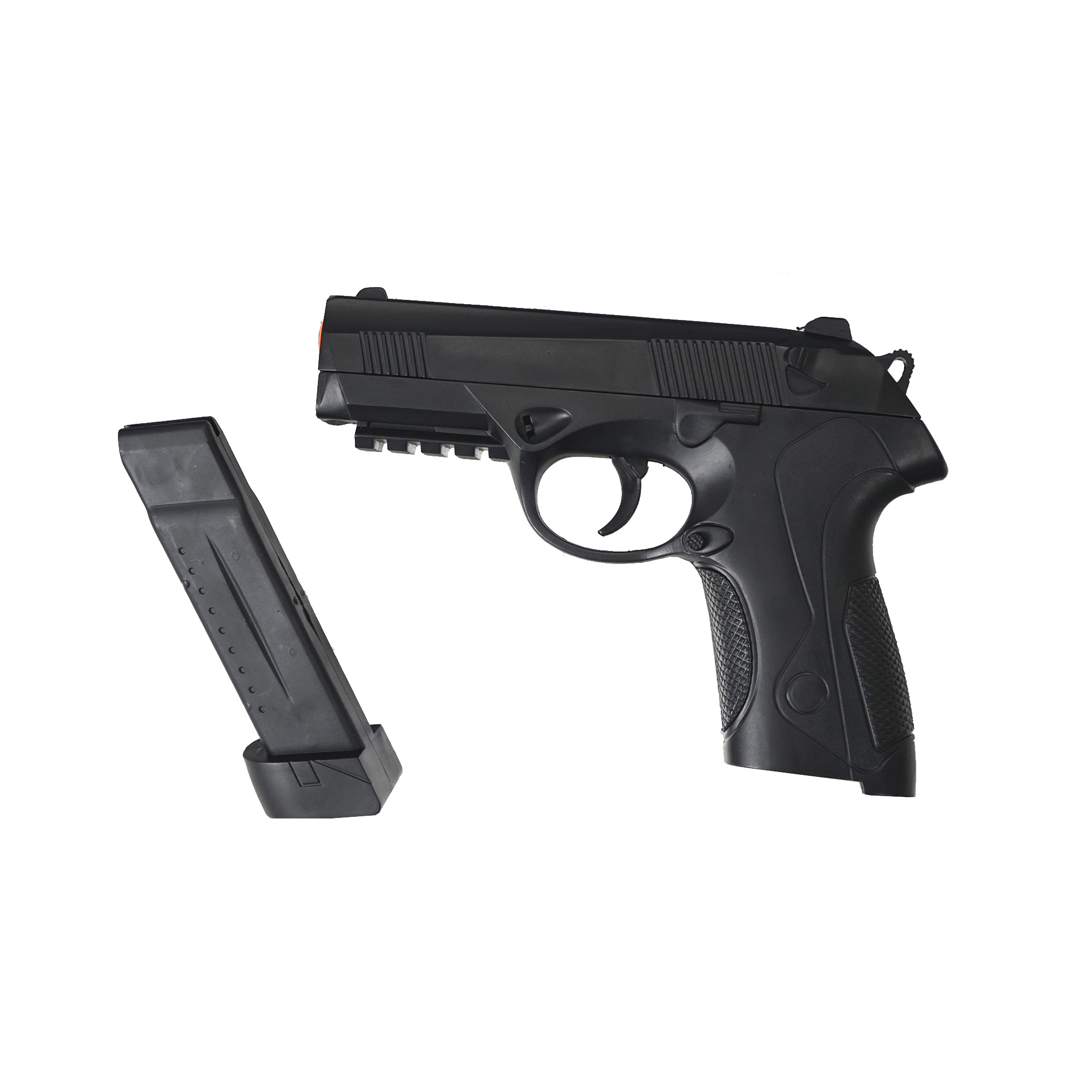 Possui alça e massa de mira fixa e magazine com capacidade para até 12bbs de 6mm.