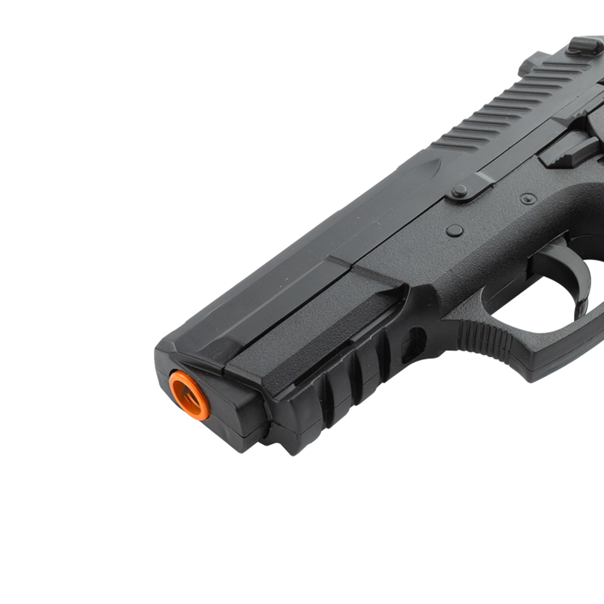 Pistola Airsoft Spring possui alça e massa de mira fixa e magazine com capacidade para até 11bbs de 6mm.