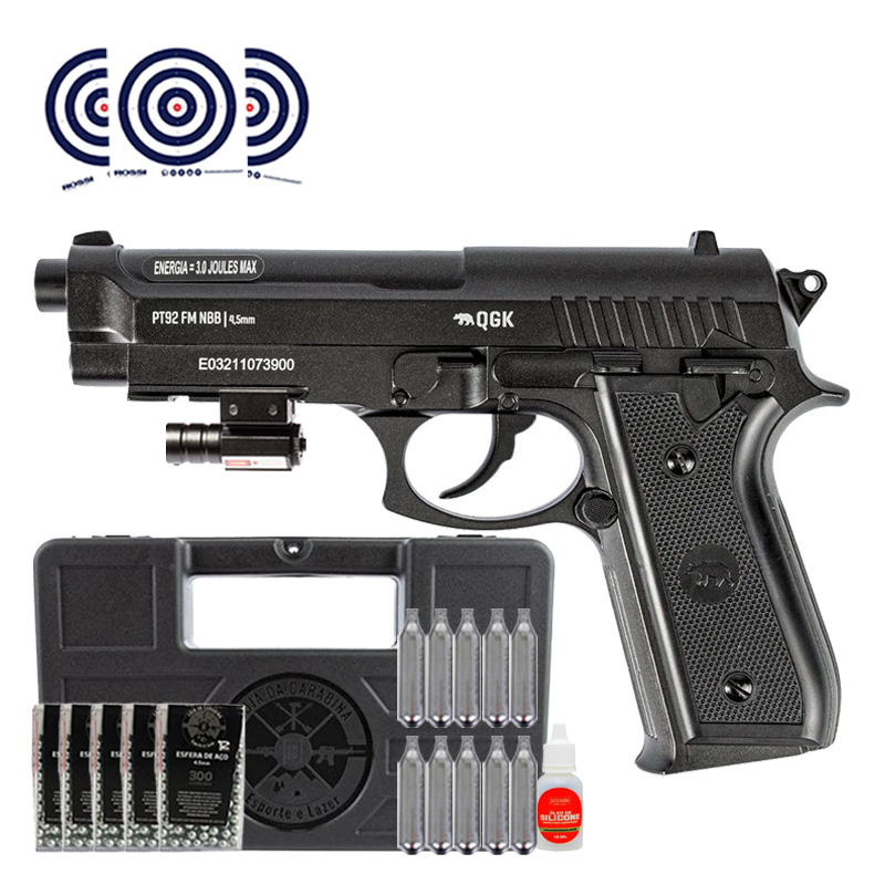 Pistola Beretta PT92 Full Metal CO2 4.5mm QGK + Maleta + Mira Laser + Esferas + CO2 + Oleo + Alvos
