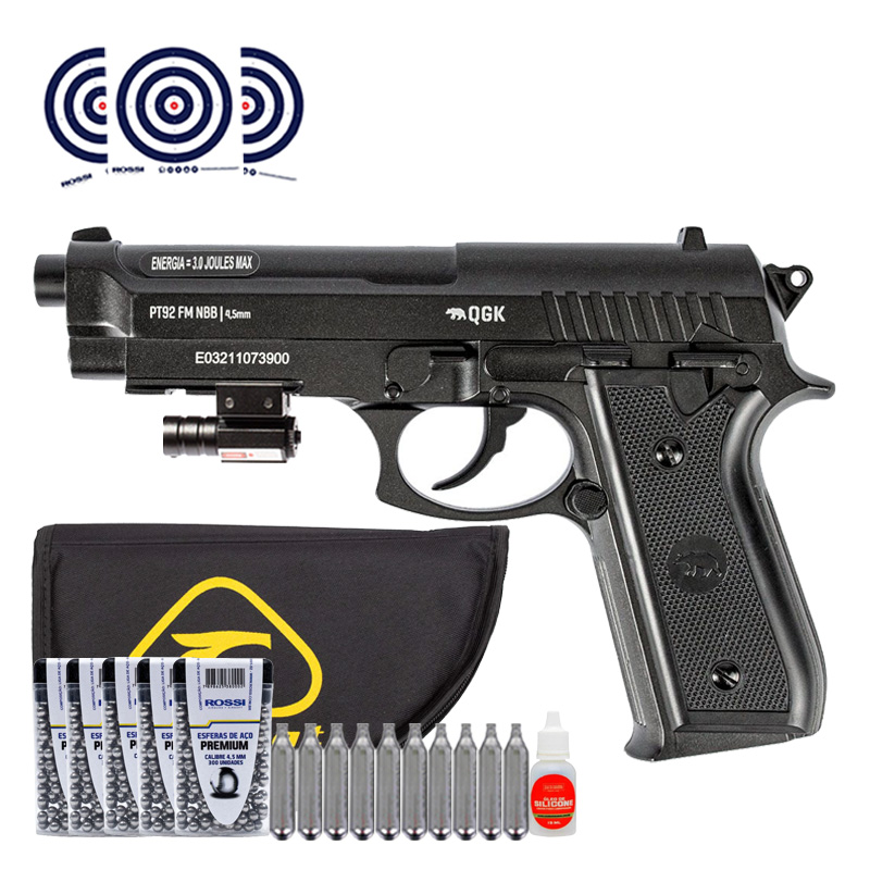 Pistola Beretta PT92 Full Metal CO2 NBB 4.5mm QGK + Capa + Mira Laser + Esferas + CO2 + Oleo + Alvos