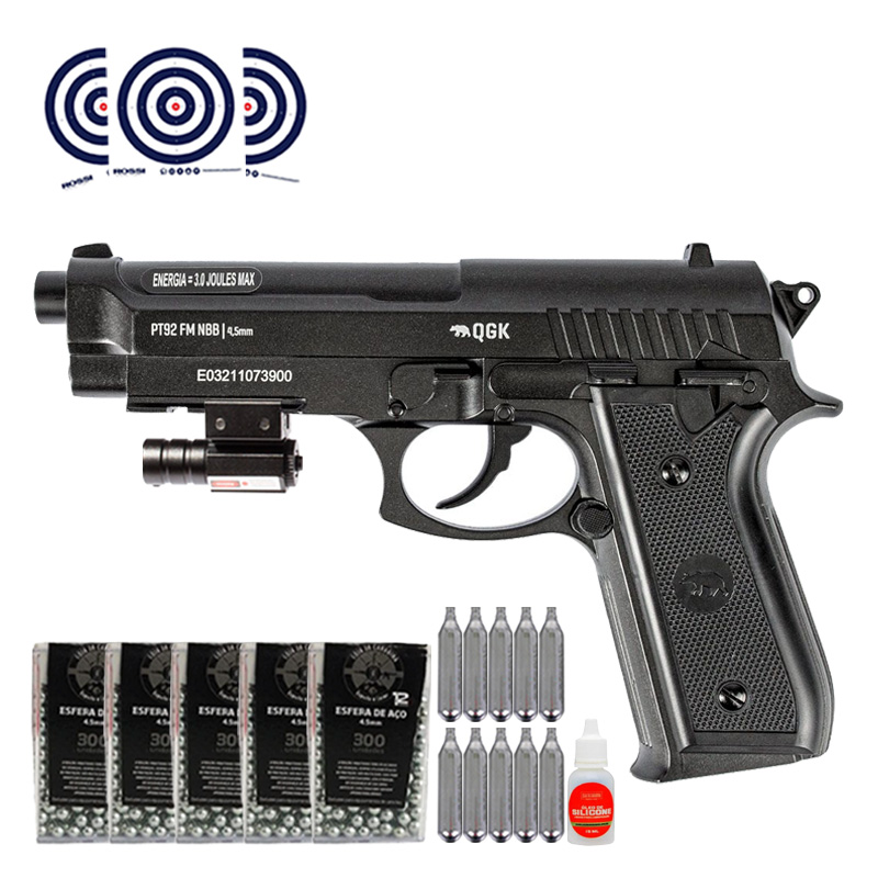 Pistola Beretta PT92 Full Metal CO2 NBB 4.5mm QGK + Mira Laser + Esferas + CO2 + Oleo + Alvos