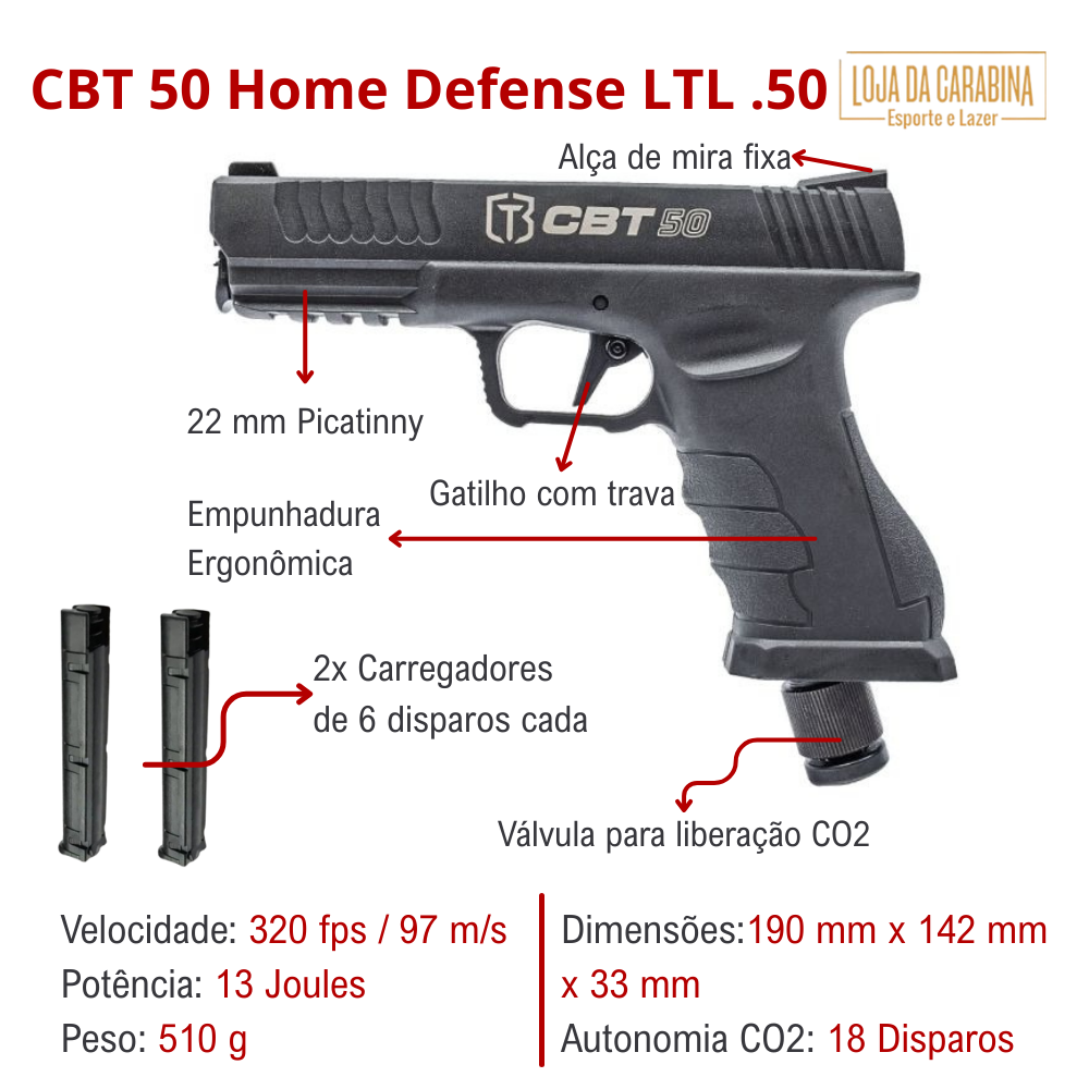Com tudo isso, a CBT 50 Home Defense LTL se torna uma das pistolas mais completas da categoria, oferecendo segurança, robustez e realismo para os entusiastas do tiro recreativo e treinamentos.