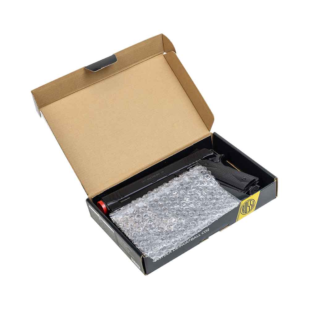 Segurança e operação: dispõe de trava de segurança manual, sistema de alimentação por cilindro de CO2 e acionamento semi-automático. O trilho inferior e o acabamento em polímero tornam o conjunto versátil para quem precisa de um equipamento funcional e pronto para personalizações básicas.