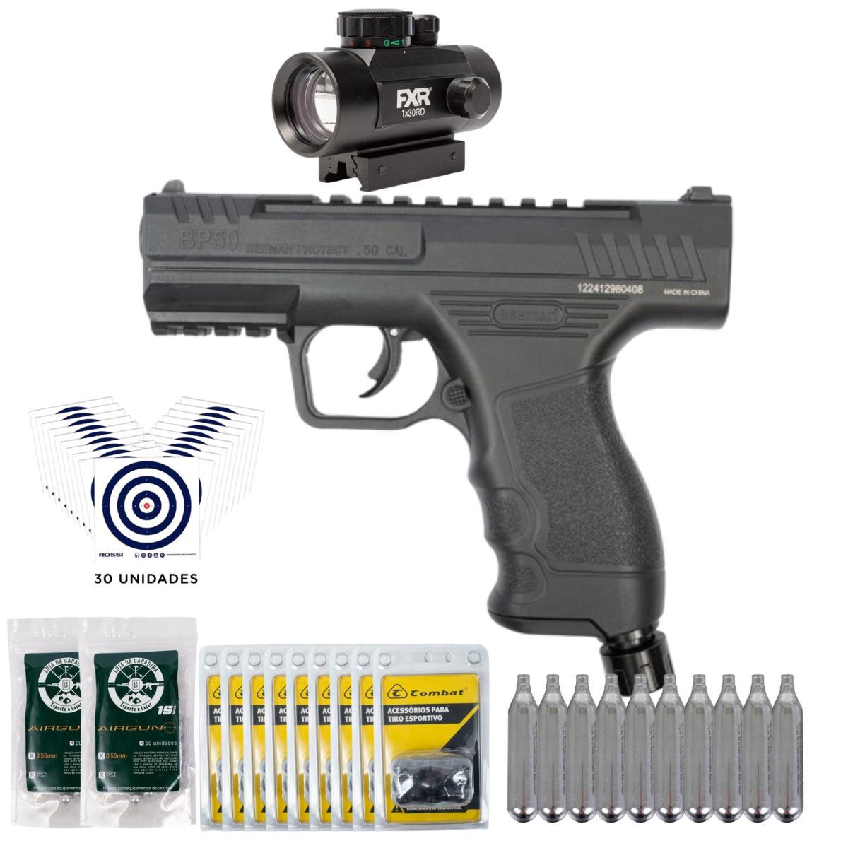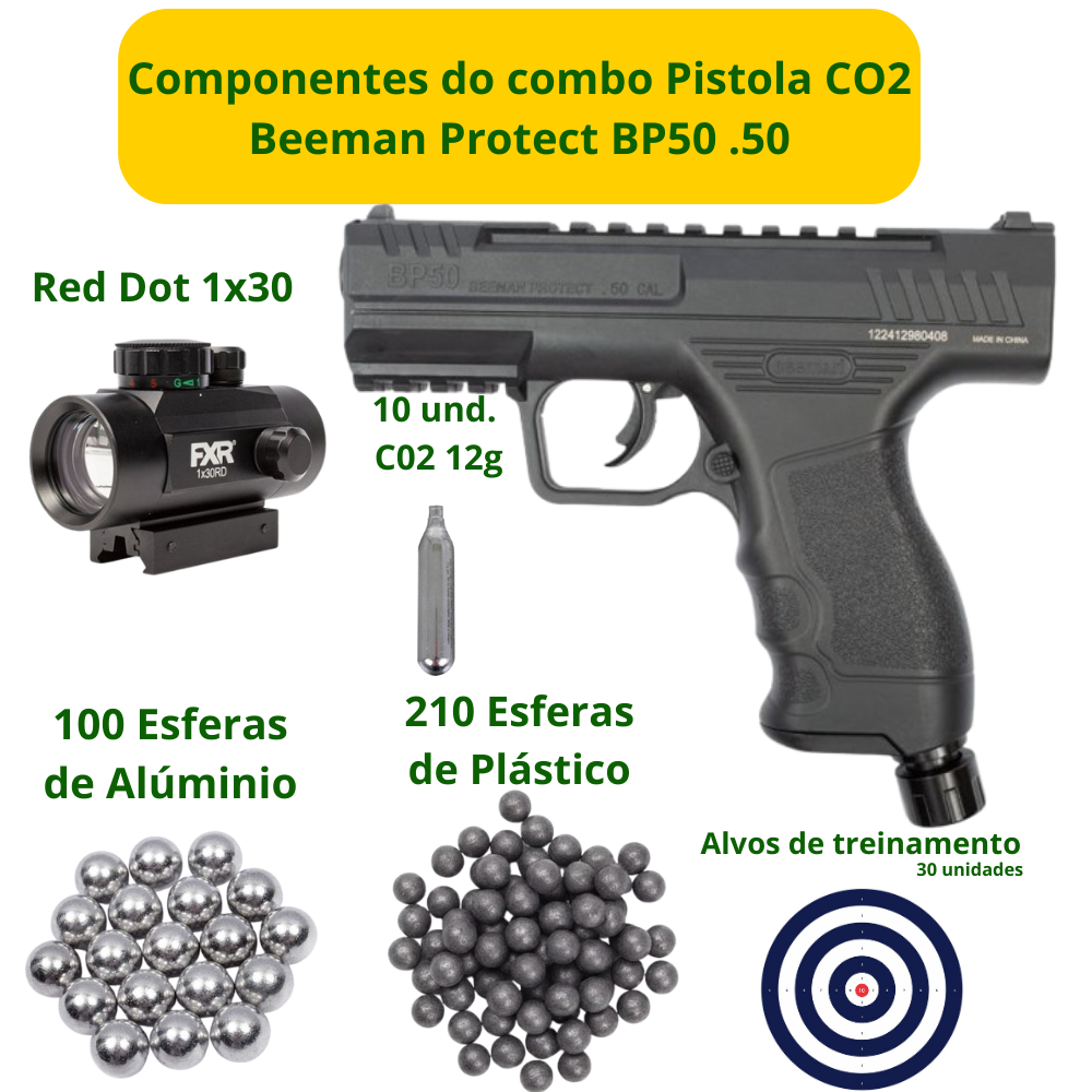 Pistola CO2 Beeman Protect BP50 .50 + Red Dot 1x30 + KIT Esferas .50 + CO2 + Alvos