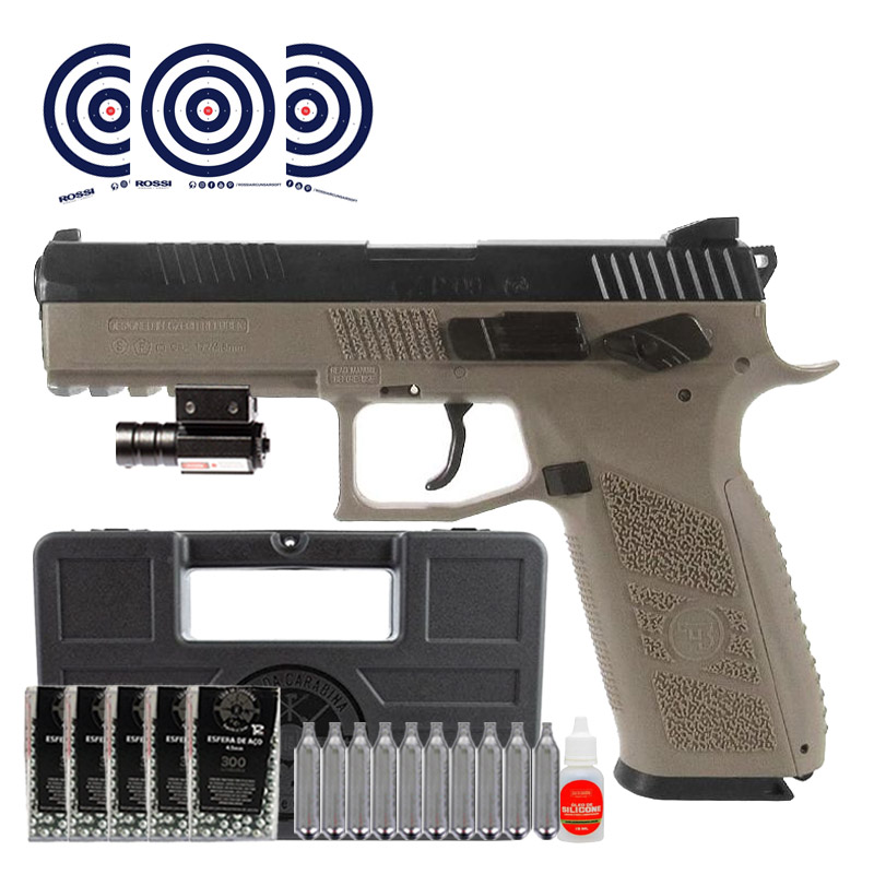 Pistola CO2 CZ P-09 Dual Tone Blowback 4.5mm + Case LC + Mira Laser + Esferas + CO2 + Oleo + Alvo