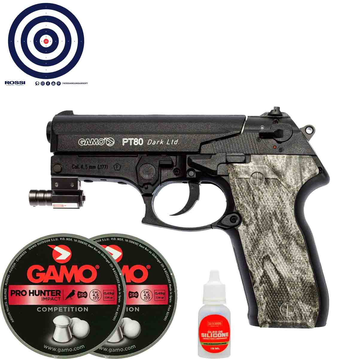 Pistola CO2 Gamo PT80 Dark 4.5mm Ltd + Mira Laser + Chumbinhos + Oleo + Alvos