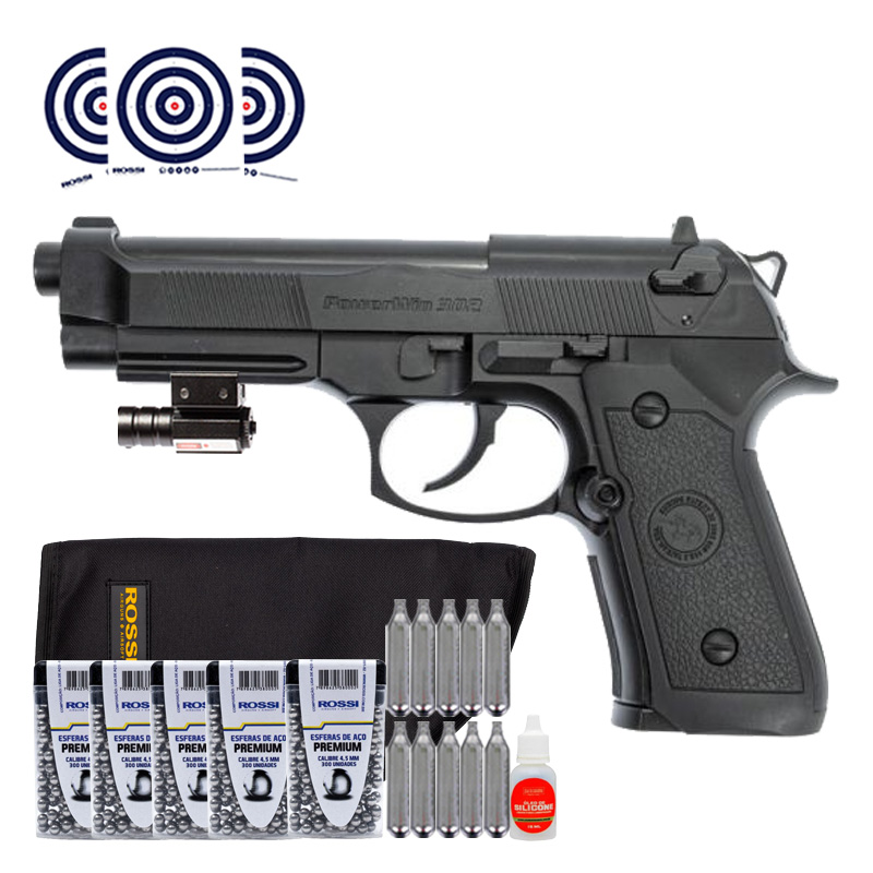 Pistola CO2 GNB Beretta M9 Rossi 6mm + Capa Combat + Mira Laser + Esferas + CO2 + Oleo + Alvos