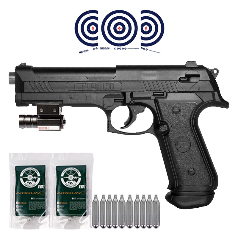 Este kit acompanha mira laser para maior precisão, esferas calibre .50 para treino, cilindro de CO2 e alvos de papel, tornando o conjunto completo e pronto para uso. Uma excelente escolha para quem busca potência, confiabilidade e versatilidade em uma pistola CO2 não letal.
