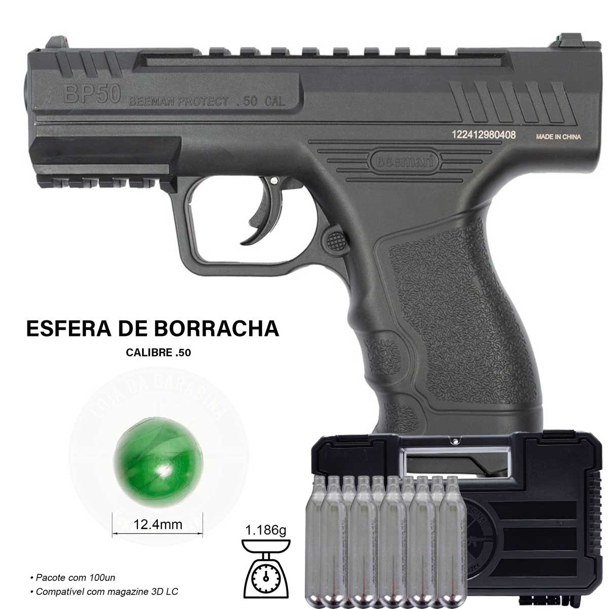 Pistola CO2 Rossi Beeman BP50 .50 Paintball + 300Un Esfera de Borracha + Case+ 10x Cilindros Co2