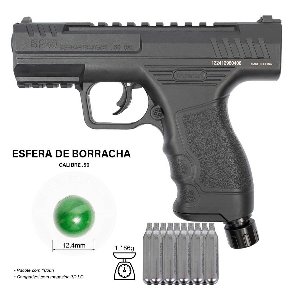 Este kit já acompanha 100 unidades de esfera de borracha calibre .50, que ajudam a manter alimentação consistente e uma rotina de treino mais estável, além de 10 cilindros CO2 12g para garantir mais sessões sem precisar comprar recargas imediatamente. A Beeman Protect BP50 é compatível com munições calibre .50 como esferas de alumínio, esferas de tinta, esferas de borracha e esferas em PVC, permitindo adaptar o uso ao seu objetivo.
