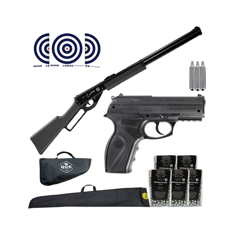 CARABINA LEVER ACTION ROSSI COWBOY PRETA 4.5 MM + PISTOLA CO2 ROSSI C11 + CAPA QGK + CAPA ROSSI + ESFERAS 4.5MM + ALVOS