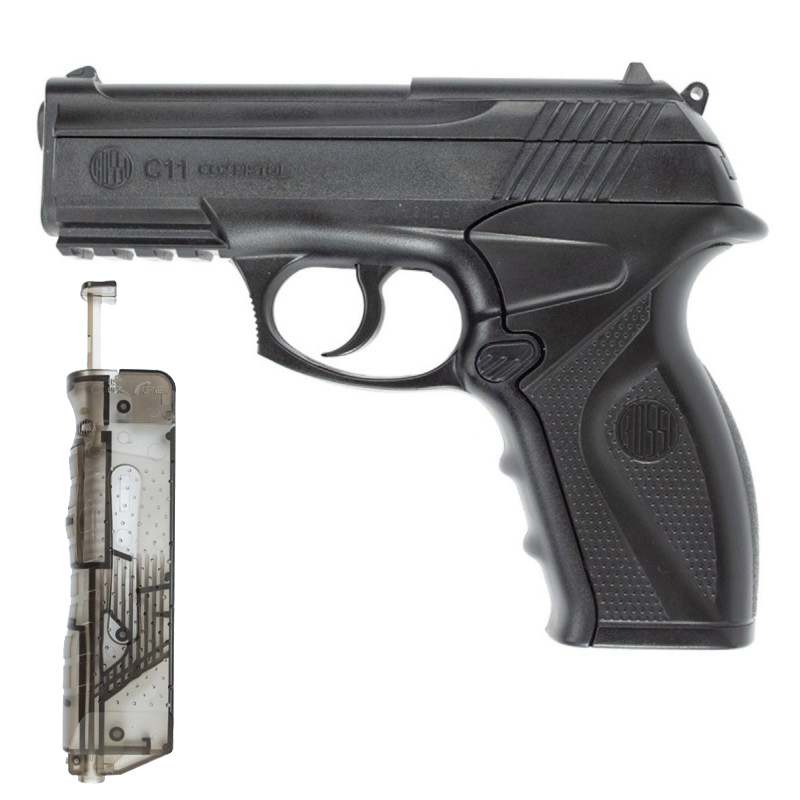 A pistola de pressão CO2 Rossi C11 4,5mm é uma das pistolas de pressão com melhor custo beneficio do mercado. Possui boa parte das peças internas confeccionadas em metal e seu corpo externo é produzido em polímero de excelente qualidade.