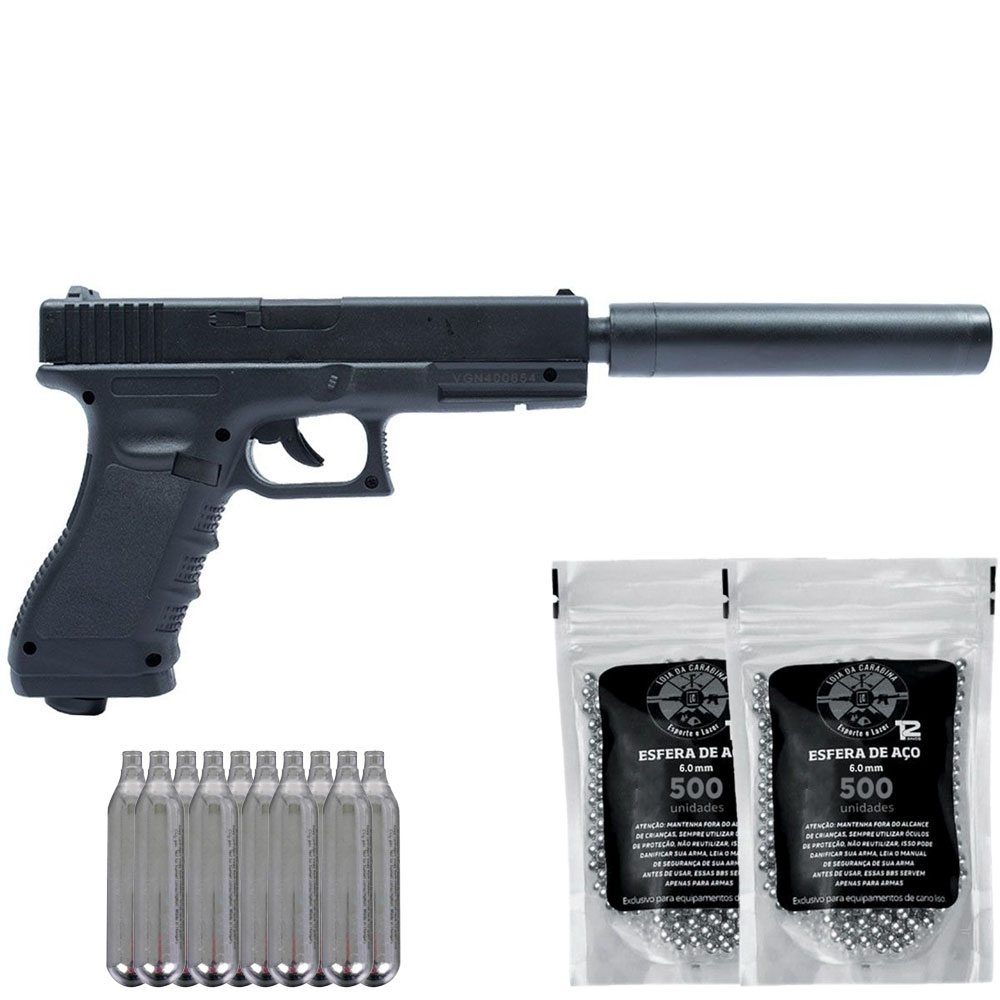 Pistola Co2 Rossi G17 Magnum com Silenciador 6mm + Cilindro + Esferas de Aço LC 1000un
