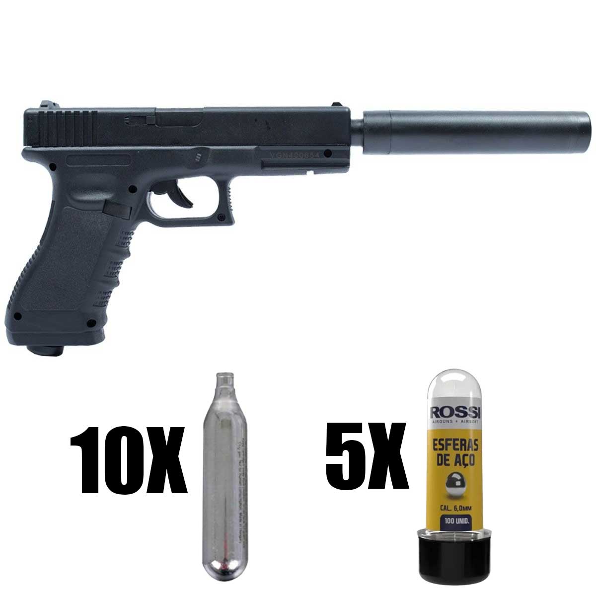 Pistola Co2 Rossi G17 Magnum com Silenciador 6mm + Cilíndro + Esferas de AÇo Rossi 500un