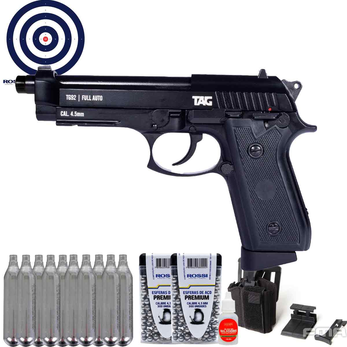 Pistola CO2 TAG TG 92 KWC PT92 Blowback Full Metal Auto 4.5mm + Coldre + Esfera + CO2 + Oleo + Alvos
