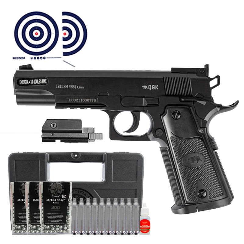 Pistola Colt 1911 Co2 NBB 4.5mm QGK + Mira Laser + Case Rigido LC + Co2 + Oleo + Esfera + Alvos