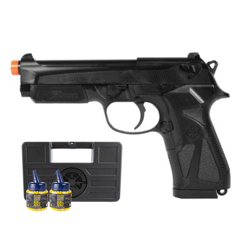 PISTOLA DE AIRSOFT BERETTA 90TWO é um modelo desenvolvido pela umarex, feito em plástico, modelo possui escala 1/1 em relação a modelo Beretta de fogo, está muito comum na Italia. Modelo acompanha cerca de 50 BB's para teste, no peso de 0,12g, cor amarela, pistola na cor preta.