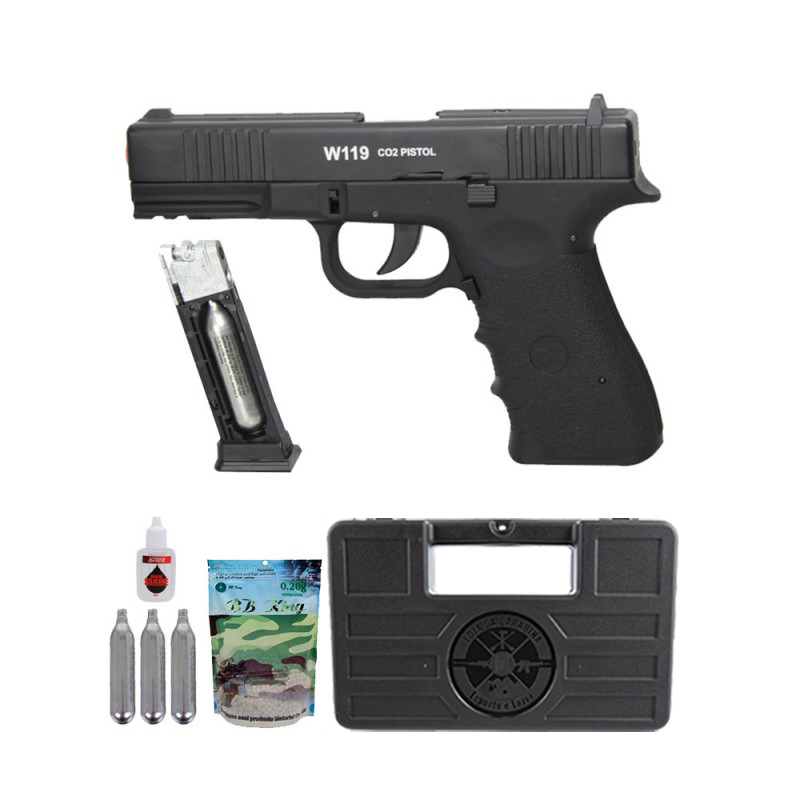 A Pistola de airsoft W119 de Co2 da wingun possui slide em metal, coronha em polímero e sistema de blowback, o que proporciona um alto realismo ao equipamento.