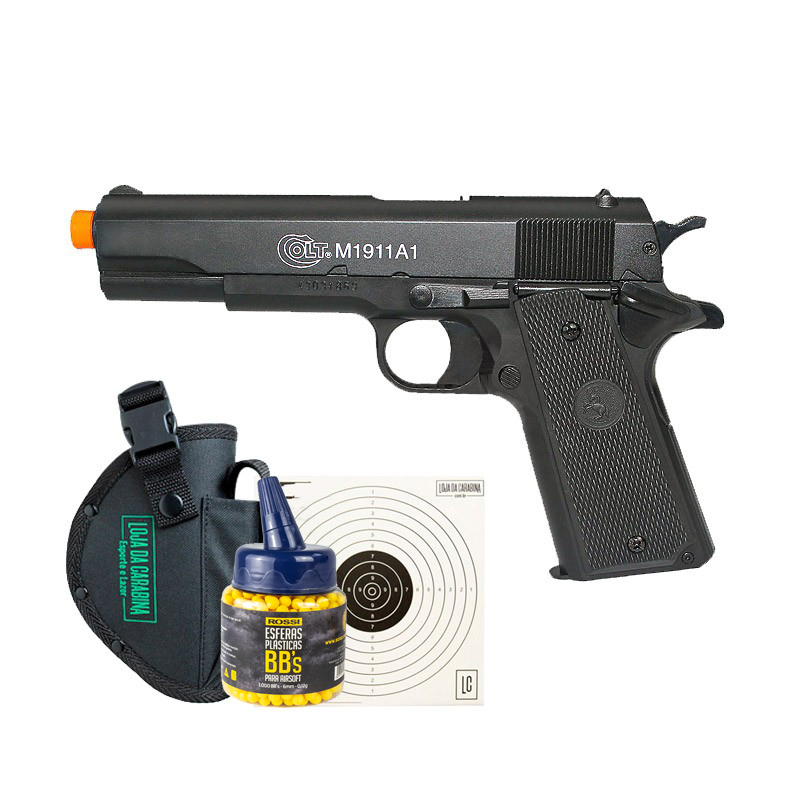PISTOLA DE AIRSOFT COLT M1911 A1 é um modelo baseado na pistola do exército americano. Possui slide em metal e corpo em abs. Possui alça e massa de mira, sistema de disparo monotiro, trava de segurança e sistema de Hop-Up.