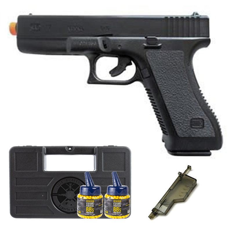 PISTOLA DE AIRSOFT GLOCK G7 é um modelo desenvolvido pela KWC, feito em plástico, modelo possui escala 1/1 em relação a Glock G17 de fogo. Modelo acompanha cerca de 100 BB's para teste, no peso de 0,12g, cor amarela, pistola na cor preta.