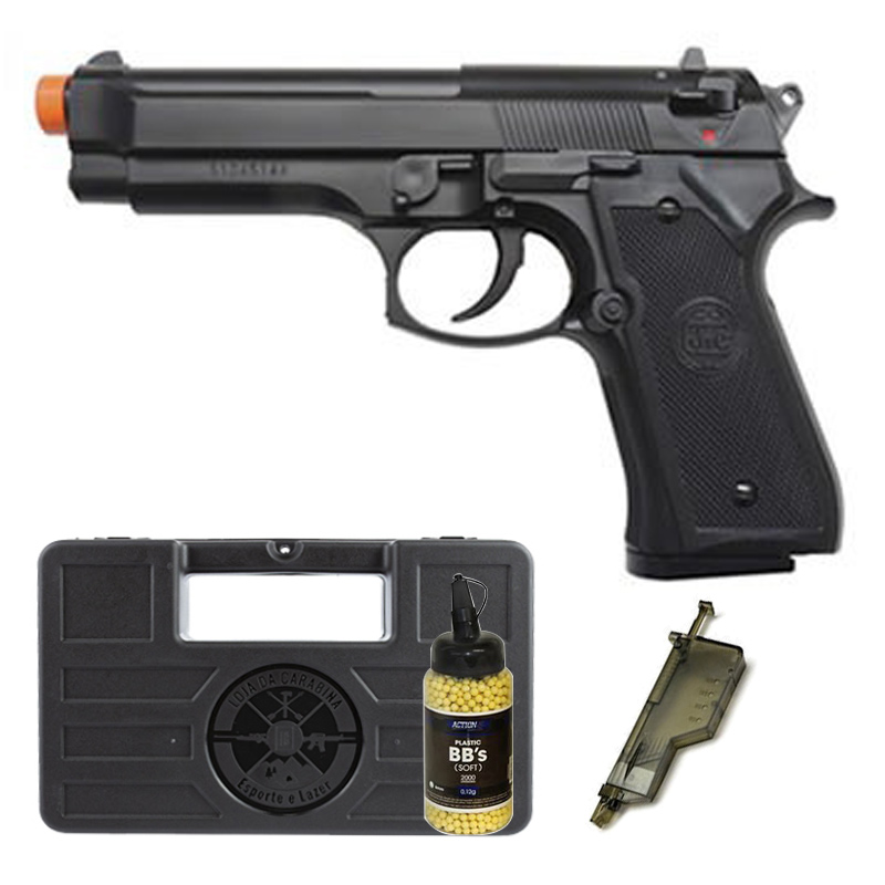 PISTOLA DE AIRSOFT M92 é um modelo desenvolvido pela KWC, feito em plástico, modelo possui escala 1/1 em relação a modelo M92 de fogo que é muito comum nos EUA. Modelo acompanha cerca de 100 BB's para teste, no peso de 0,12g, cor amarela, pistola na cor preta.