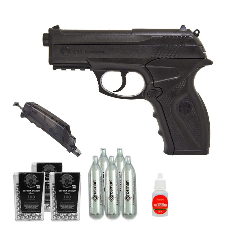 PISTOLA C11 6MM + SPEEDLOADER + ESFERA DE AÇO + CO2 + ÓLEO