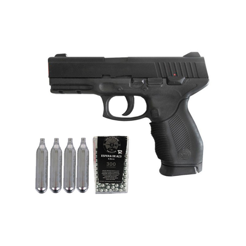 Pistola de Pressão Co2 KWC 24/7 no calibre 4.5mm, possui slide fixo com alimentação por cilindros de co2 0,12g. Construída em polímero de alta resistência.