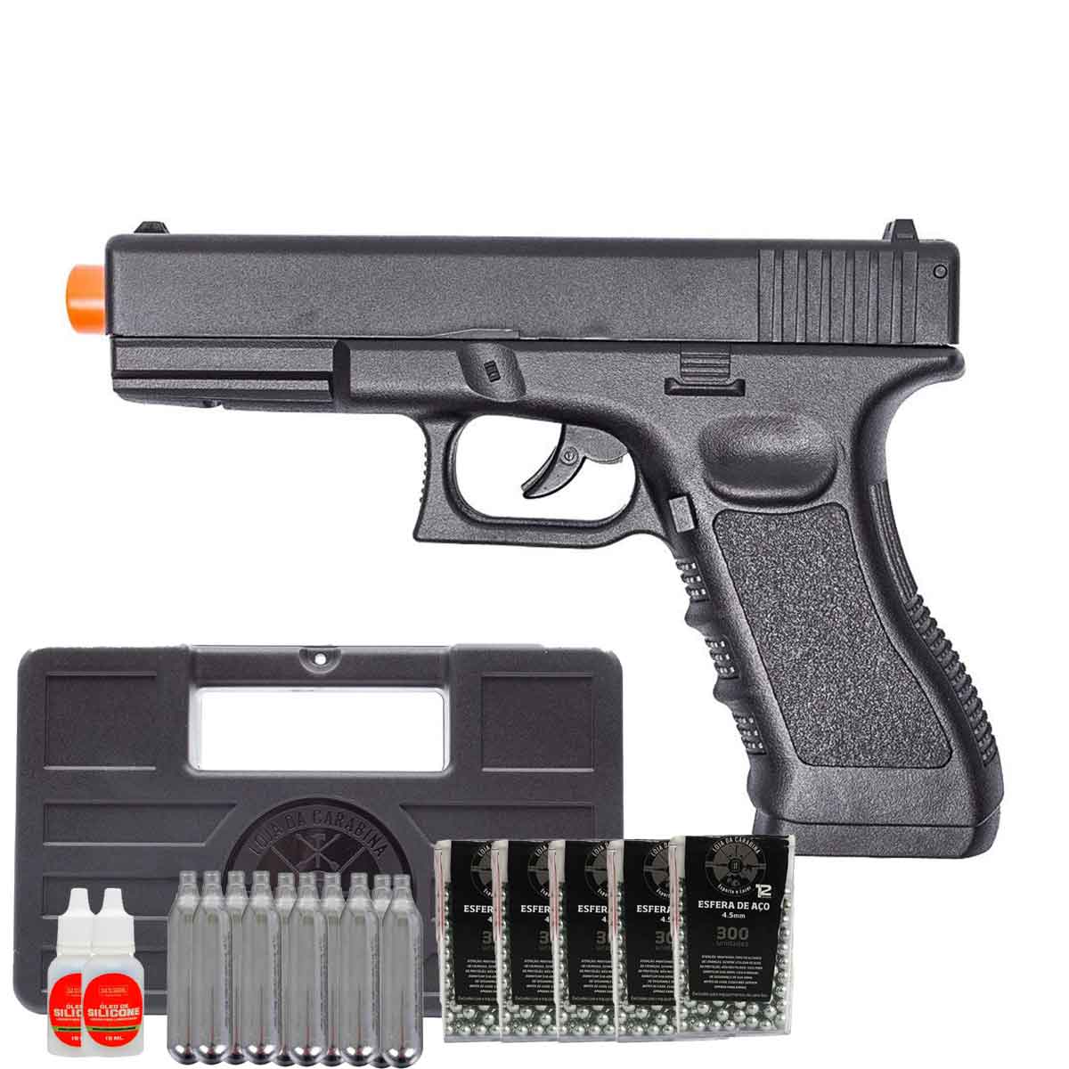 O kit inclui 5 embalagens de 300 esferas (ideal para muitas sessões de treino), 10 cilindros CO₂ 12 g para autonomia imediata, 2 frascos de óleo de silicone 15 ml para lubrificação e conservação dos mecanismos, além de uma maleta rígida com forro em espuma para transporte e armazenamento seguros. É a solução completa para quem procura entretenimento, treino de tiro ao alvo e praticidade, tudo pronto para uso desde a entrega.