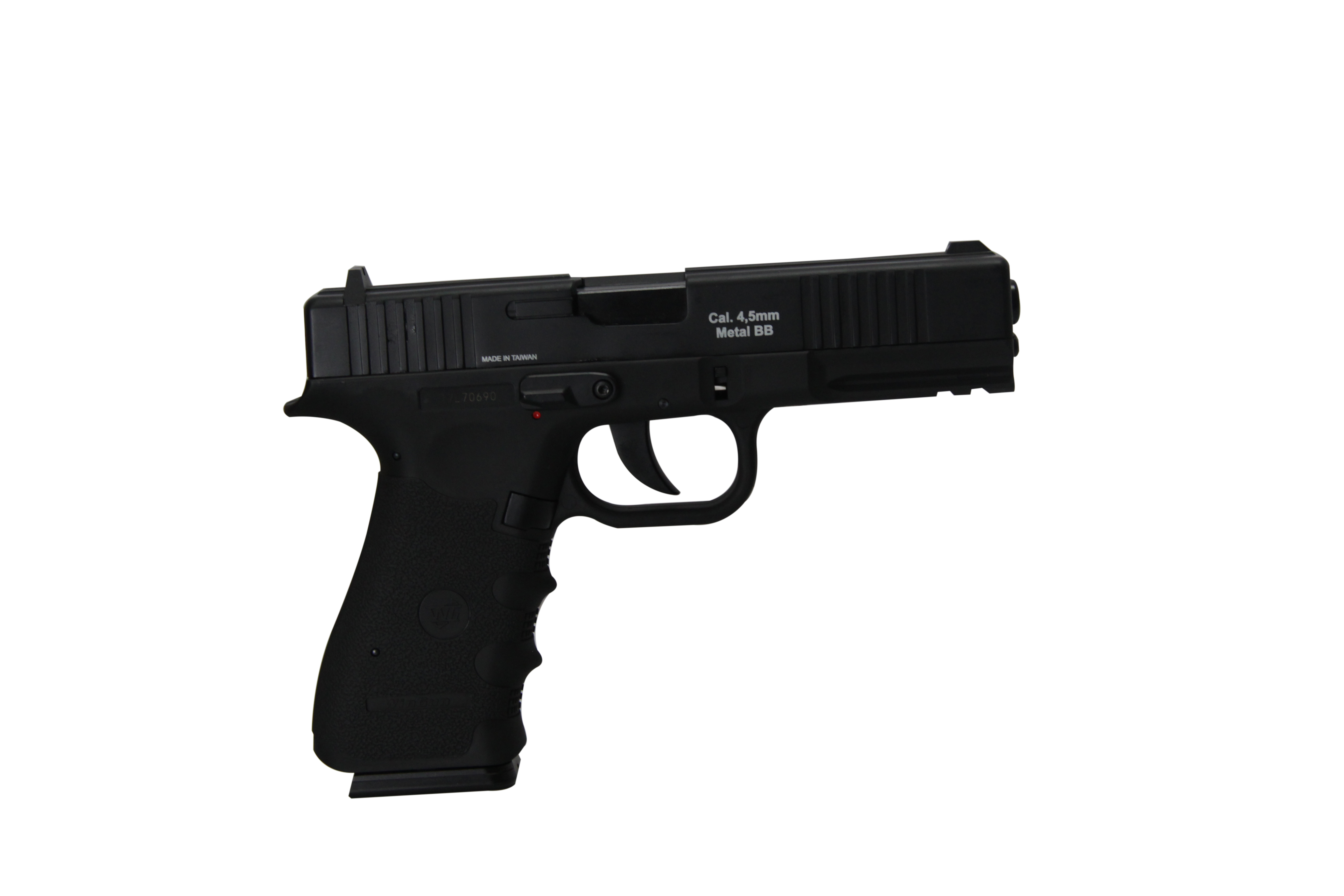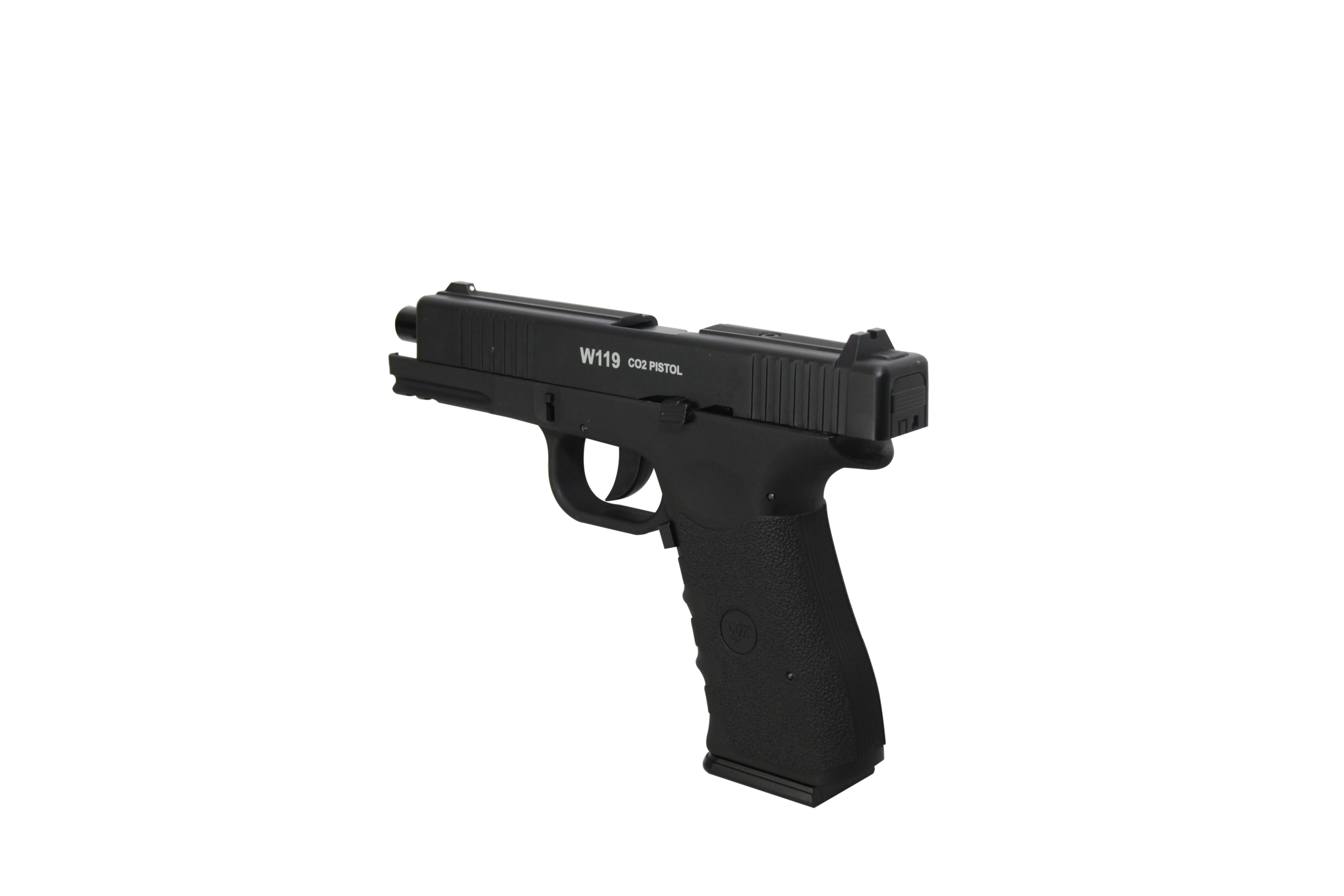 A Pistola W119 de Co2 da Wingun possui slide em metal, coronha em polímero e sistema de blowback, o que proporciona um alto realismo ao equipamento.
