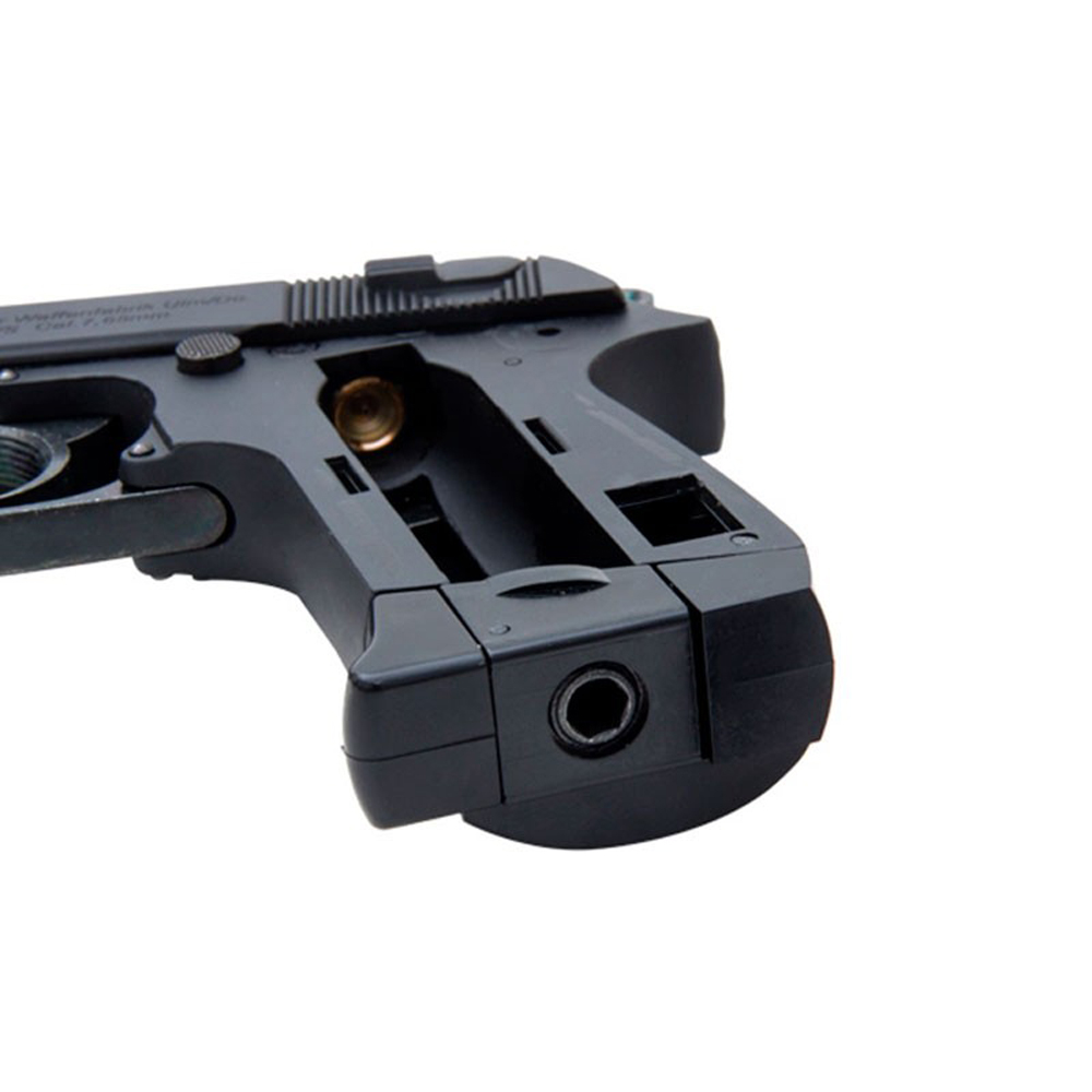 Grip Texturizado, trava de segurança manual ao lado do gatilho, slide em metal, alimentação por cilindros de Co2 0,12g.