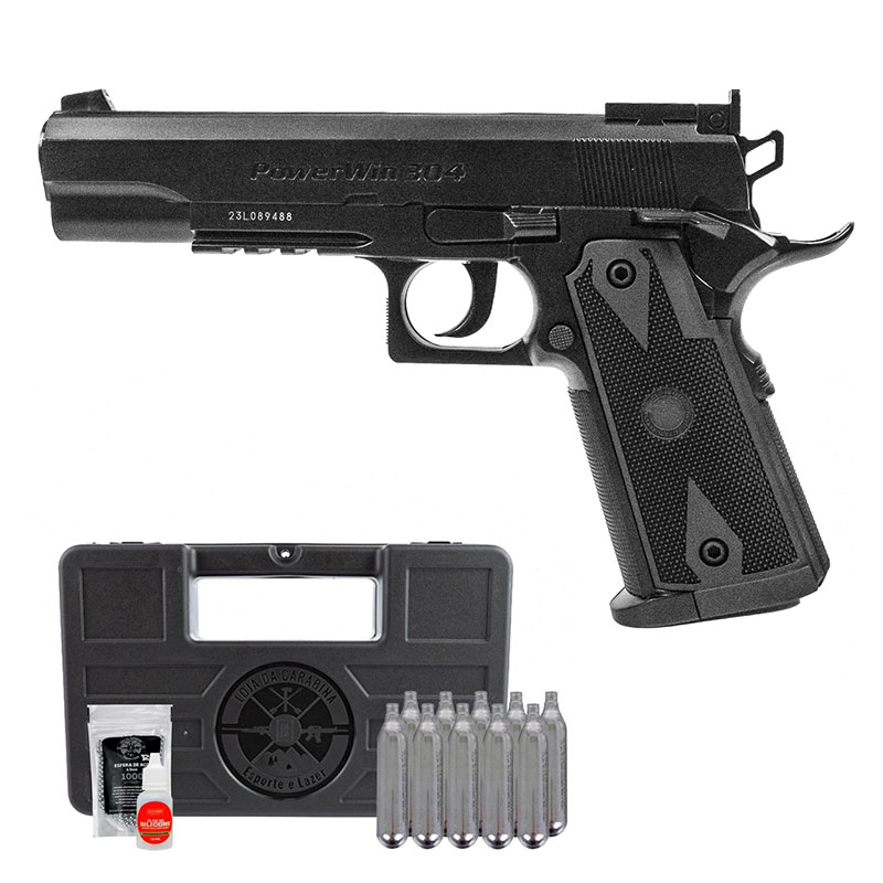 Acompanha uma maleta LojaDaCarabina para facilitar na hora do transporte, um pacote de esferas de aço 1000 Un, 10 cilindros de Co2 12g e um óleo de silicone para manutenção do equipamento.