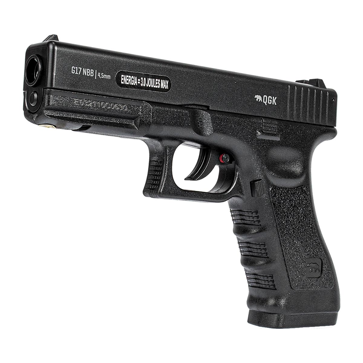 Inspirada na pistola de fogo Glock 17 4GEN, essa Pistola de pressão da QGK co2 é um lindo modelo que oferece excelente desempenho alcançando velocidade de 137 m/s (450 fps) com potência de 3 joules no calibre 4.5 mm (.177).