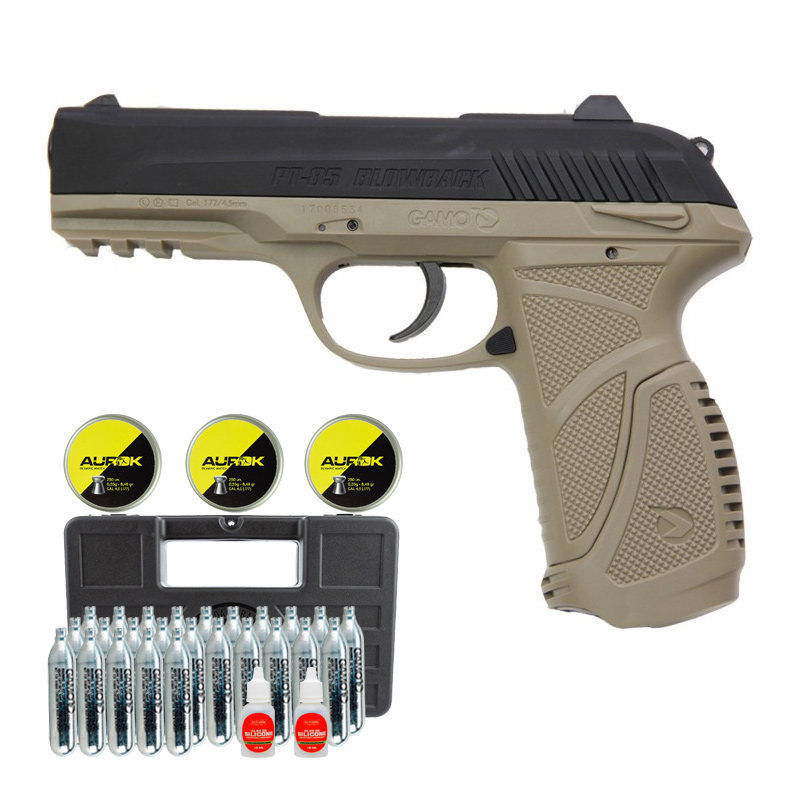 PISTOLA GAMO PT 85 CO2 GBB DESERT + CHUMBINHO + CO2 + CASE + ÓLEO DE SILIONE