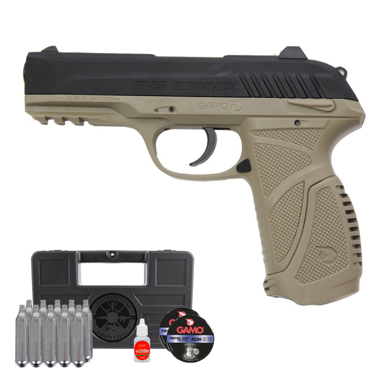 PISTOLA GAMO PT 85 CO2 GBB DESERT + CHUMBINHO + CO2 + CASE + ÓLEO DE SILICONE