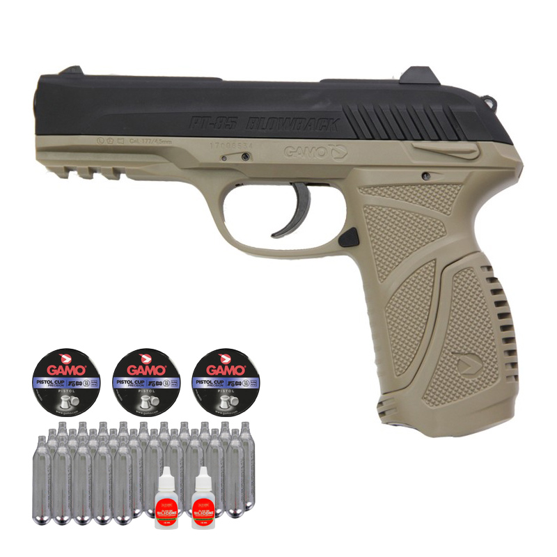 PISTOLA GAMO PT 85 CO2 GBB DESERT + CHUMBINHO + CO2 + ÓLEO DE SILICONE